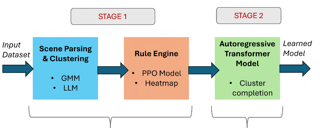 Overview of our proposed framework. Our method for space-aware furniture recommendation and placement consists of scene parsing, rule engine-based prediction, and finally, autoregressive transformer modeling steps.